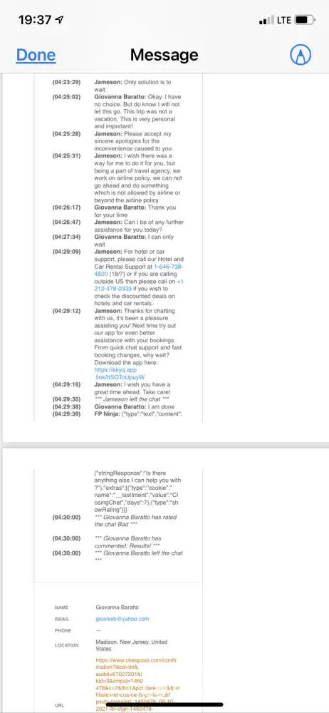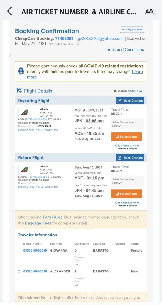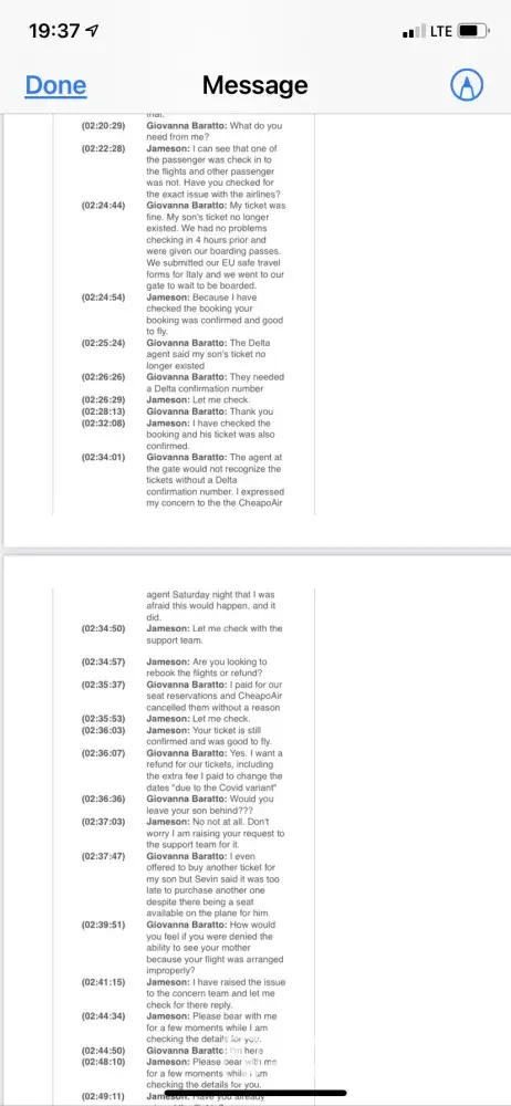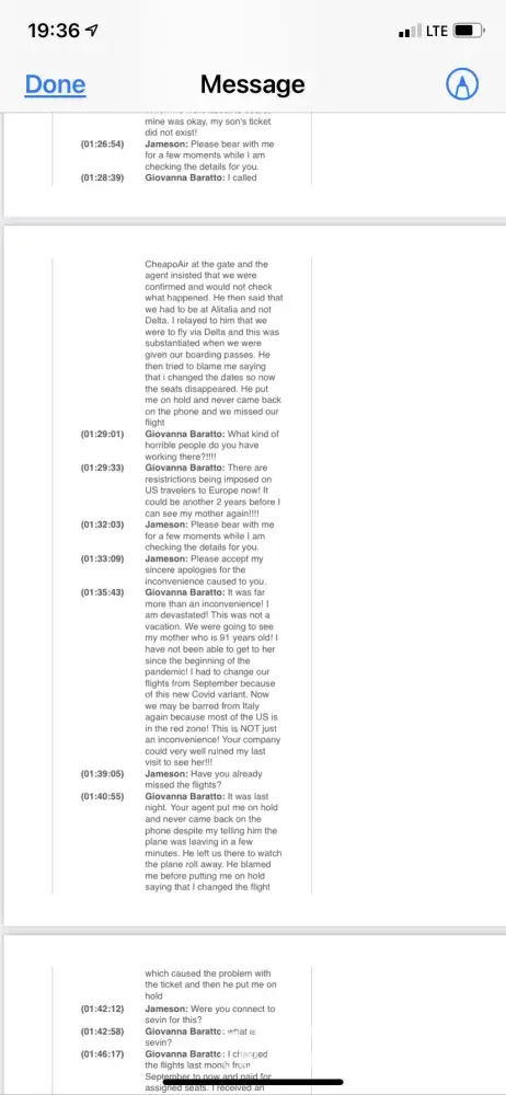 I am filing a formal complain regarding mine and my son's flight reservation through CheapoAir. As I indicated to every CheapoAir and Delta staff I spoke to - this was not a vacation! We were on our way to see my mother, Ines Marcolongo, who lives in Abano Terme, Padova. She is 91 years old and alone! Because of the pandemic travel restrictions, we missed both her 90th and 91st birthday (April 7, 1930). My father, her husband of 56 years, passed away so this visit was also my last-ditch effort to convince her to return to the United States since she is now completely alone! A refund of our tickets is the least CheapoAir could do for us! I am completely devastated because now we may not be able to see her again for yet another year due to the new Delta Variant. Moreover, I am terrified she may not live another year because of her health status and her depression due to a year in solitude from lockdown! She has fallen on multiple occasions. She has called me while I am at the hospital here in the U.S. for my internship in Respiratory Therapy because she's spilled boiling tea on her lap. But she refuses to get help because of Covid. The main strategy was to help convince her to come home so I can take care of her here!