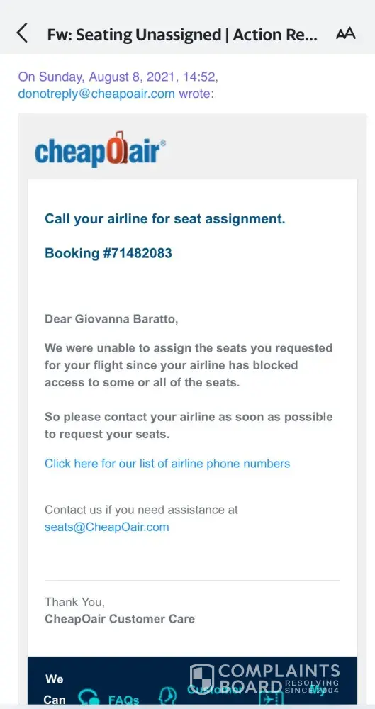 The evening prior to departure, Sunday August 8th, I received an email indicating that our seats are no longer valid. This time, both my son and I are calling CheapoAir simultaneously trying to get a hold of an agent to find out what happening now! And once again, I am either put on hold indefinitely or I am hung up on. My son could not get anyone on the phone but I did manage to reach two different agents who explained that the airline had to be changed but assured me that there would be no problem. The first agent told me to call Delta to get the new airline confirmation number because he did not have anything on record for Delta. I called Delta and the Delta agent said that they could not do anything without the airline confirmation number which needs to be supplied by the travel agency. After several more calls, I reached the second agent and she reassured me that this was still the correct airline confirmation number and that we will have no trouble boarding the plane. I reiterated to her that I paid for our seat selection so we wouldn't have to worry for problems like this. She stated that I will have to secure the seats again at check-in. She reimbursed me the $21.90 and assured me once again that we will have no problems with the flight, and to make sure we go directly to Delta Airlines for check in.