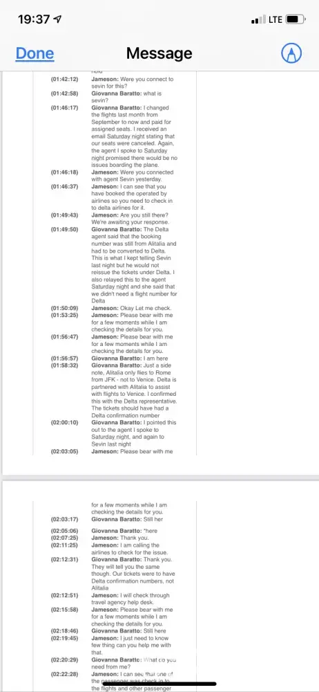Initially, my son and I were to travel September 7th; however, as a Respiratory Therapist I have first-hand knowledge of the severity of this Delta Variant. I exercised my right to one change in the flight schedule per Alitalia protocol. I literally spent 4 ½ hours on the phone and had to go through 8 different agents before I could finally reach one who would help me. Your agents would either put me on hold indefinitely or literally hang up on me. I reached a point where I was begging them to please not hang up on me - and they did anyway. By the 5th agent I began to inform them that our calls were being recorded but nothing changed. I am more than happy to share these recordings with you in addition to supporting documentation. This forum only has a link to download photos and videos.