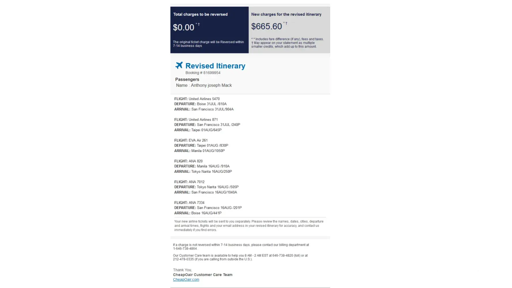 After two weeks, when looking at my credit card statement, I discovered that I was charged twice for the same purpose (same passenger travelling the same route). I contact again cheaoair call center and they said they will study my case and get back to me in 10 days. Which they have not yet. This is an abuse of consumer rights, it turns out the e-mail was inputted wrong, and no e-mail was delivered to me, the e-mails they claim to have sent both bounced back, knowing that my correct e-mail is on file with them as I always book my flights online with them.