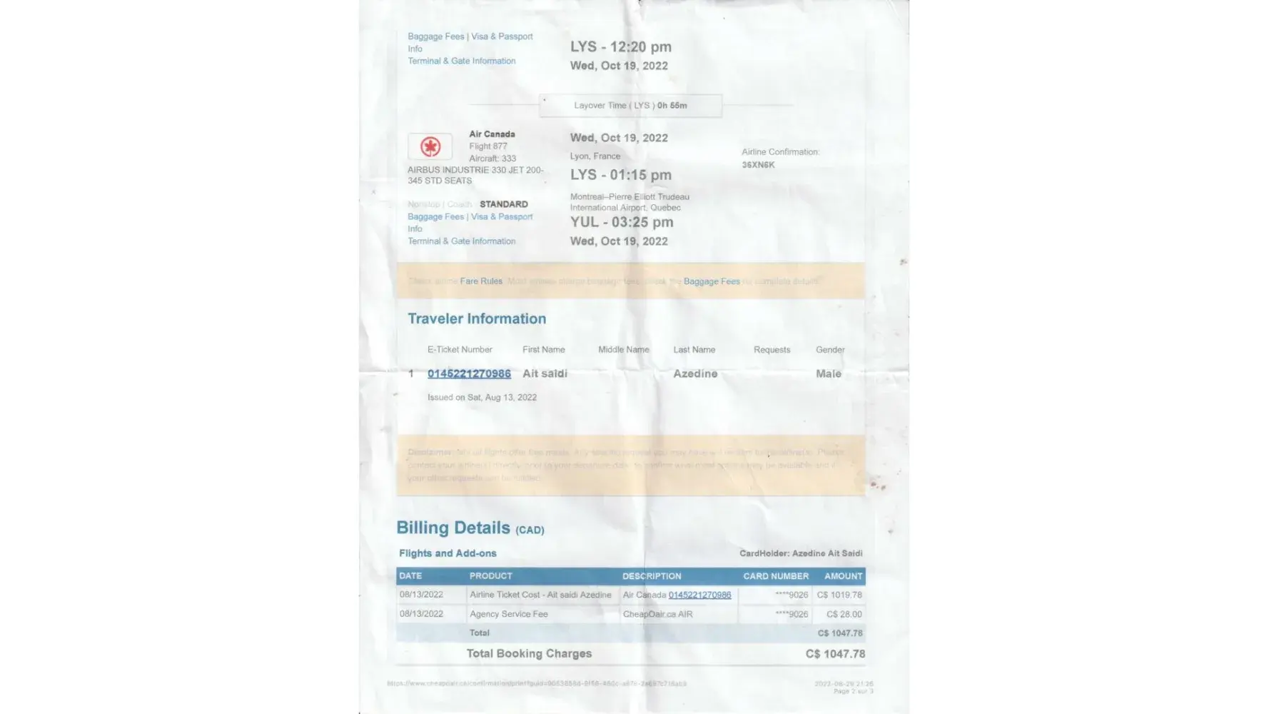 Good morning,I am writing because I purchassed a ticket with you and the return flight hours were changed without informing me. I had to pay another ticket wich cost me 870$, in order to come back to Canada.I called Air Canada to now why they did not inform me.They replied that CheapOair did not provide them my email.Under, you will find my flight confirmation.
