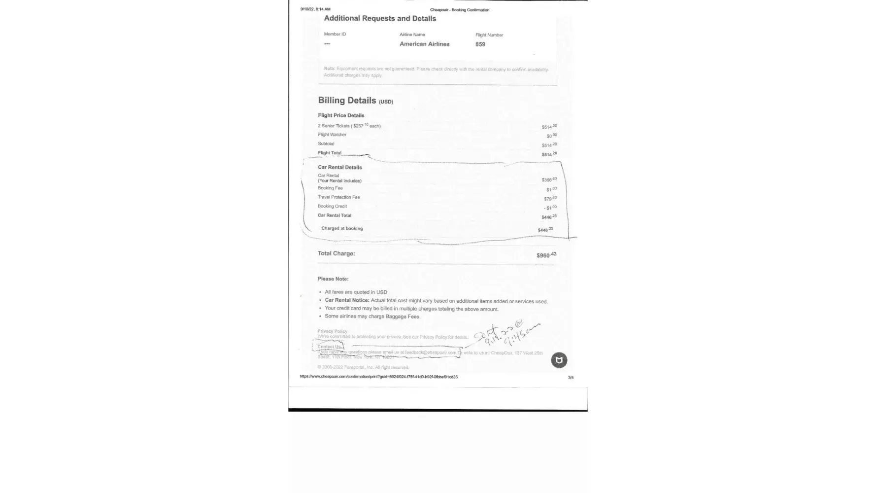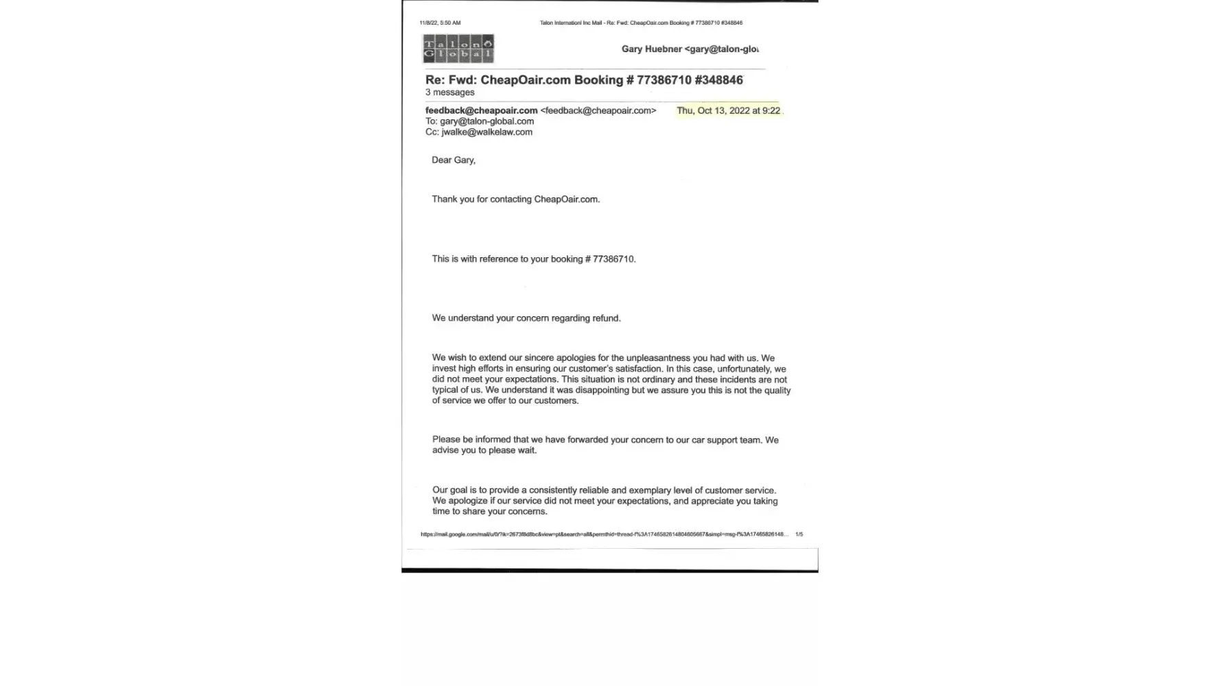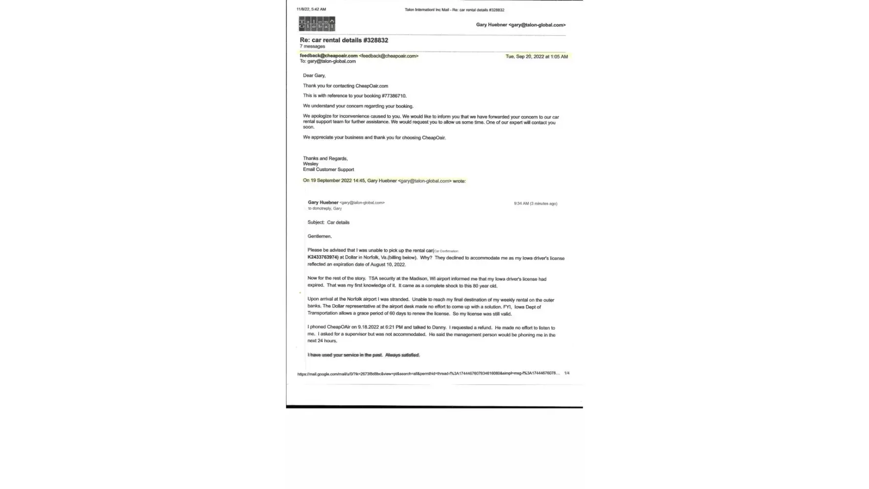 Summary of all email communication and docs are available upon request. No one from CheapOair would speak to me verbally.