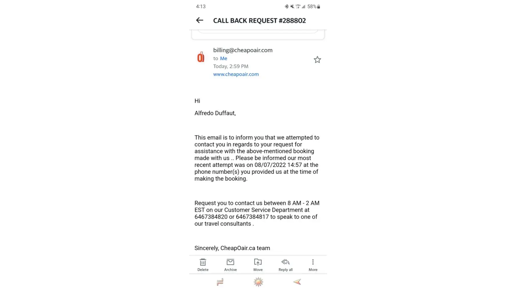 After filing a prior complaint to this one I received an email from the billing department requesting I call them back indicating the phone number I should call.. Well, I did call back and the person who answered my call asked how can I help you, I proceeded to explain that I received an email from cheapoair billing department asking for me to call back, then this representative transferred me to the billing department which that person who answered asked again how can I help you! I explain again everything from the beginning and that person put me on hold for several minutes then when he came back told me that he needed to transfer me to another department. After a few minutes the representative from that department asked me how can I help you? For the third time I had to explain from the beginning and the call was ended!