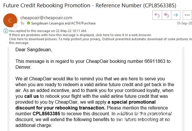 The only information I got is that the special promotional offer which is clearly not the credit date is one year. And you clearly said on the email that “contact us when you are ready to rebookâ€. And we do need to rebook now not one year ago. Is that our problems that we call you now because we need to rebook now not one year ago that we were in a lockdown and not knowing when we ever had the chance to go abroad ever again?