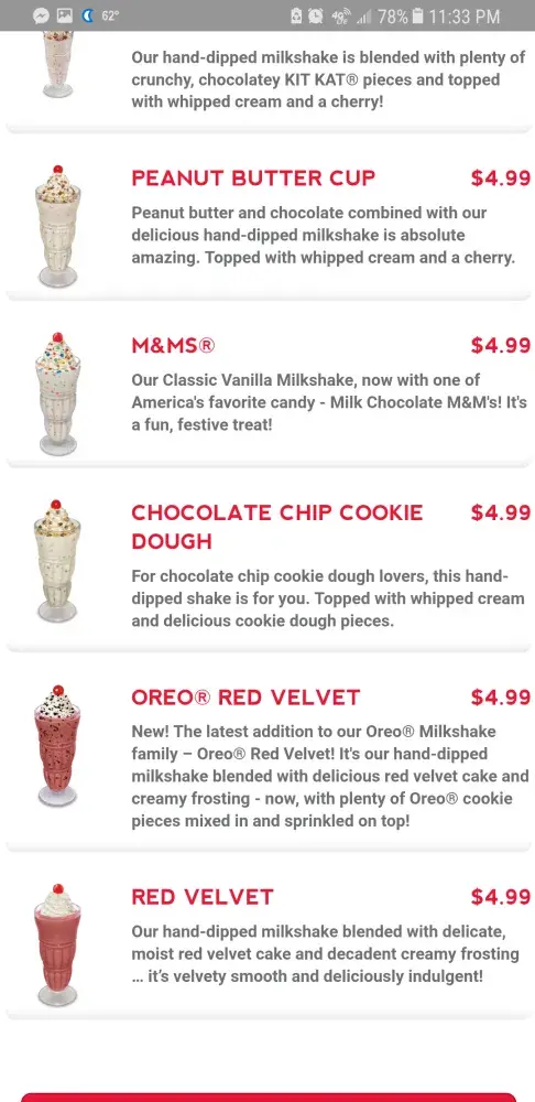 I had ordered a banana milkshake was charged for and give a strawberry cheesecake on. My 2 Apple pies were missing. Also ordered garlic park cheesticks and fries, had about 20 fries 2 cheesesticks.the only thing on order that was correct was the leadership sm Oreo fudge. So I paid 7, 77 plus tax on items that were wrong and I had to throw away. Also said they were out of popcorn chicken which was why we went