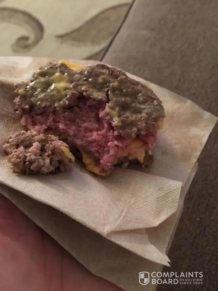 I went to Rally in Arnold Missouri July 26, 2017 12:40 am and ordered a medium Big Buford combo with Sprite and two mushroom and swiss burgers didn't receive any receipt and my burgers were not done. I live in lemay mo. I got home and started eating and noticed my food was not done so I took a pic and then had to go any cool my burger longer to make it edible.