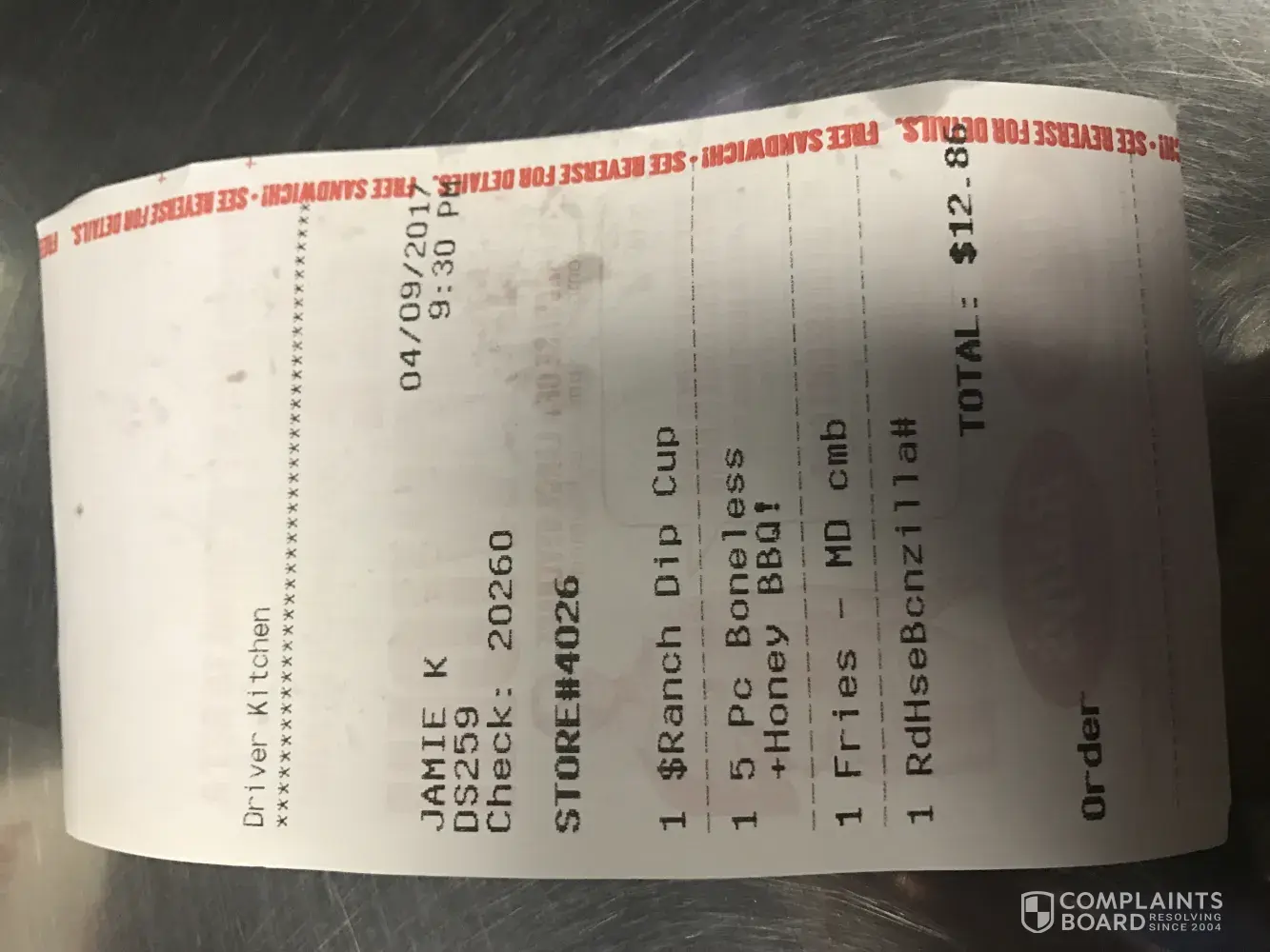 By this time there were about five cars behind me. The man directly behind me started honking and yelling. The woman ahead of me put her hand out of her car window and shrugged. Another five or so minutes went by. Finally I got up to the window to pay for my food. I received my receipt which was time stamped 7:36 PM. Again I began the wait. All the while the man behind me kept honking and yelling intermittently.