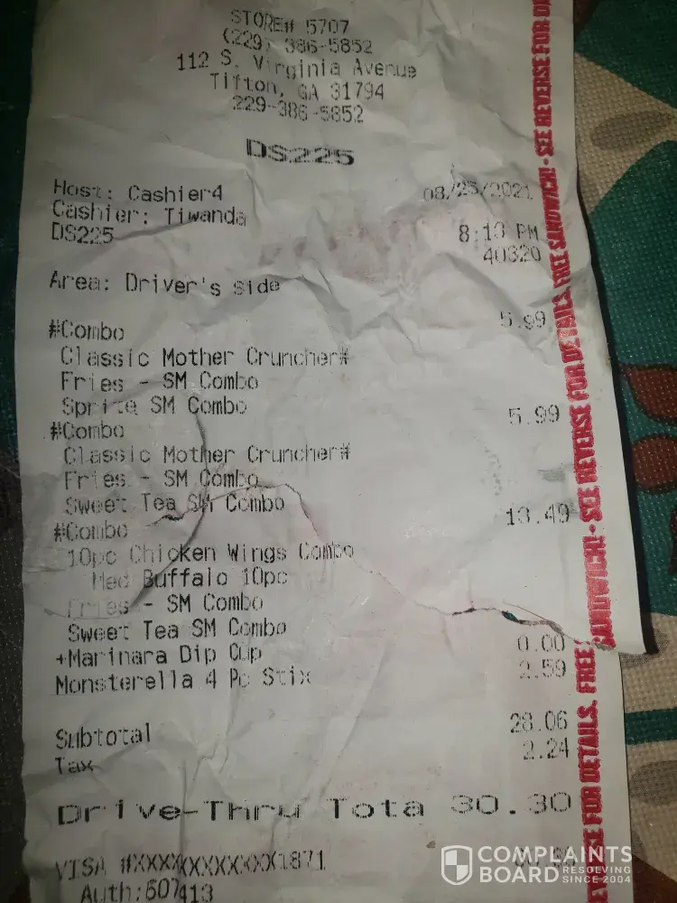 Went to Checkers in Tifton Ga. On August 25, 2021 traveled 20 miles round trip. Ordered 2 Classic Mother Crunches. Photos are attached to this complaint of how they looked. The breaded around the chicken which should have been fried and crispy was black and saggy and saggy the chicken inside have been sitting under the heat lamp for probably over 12 hour...