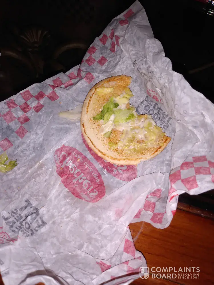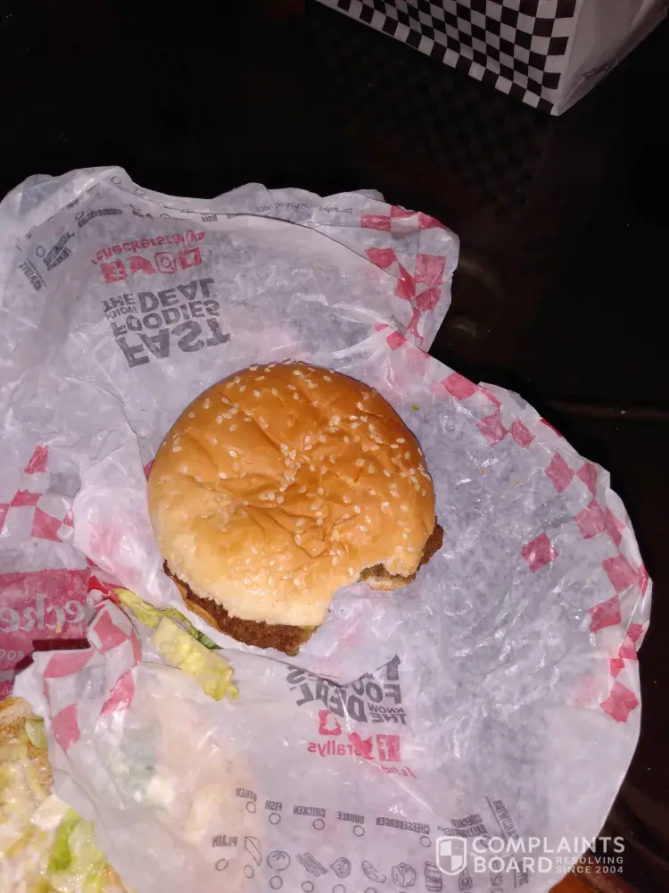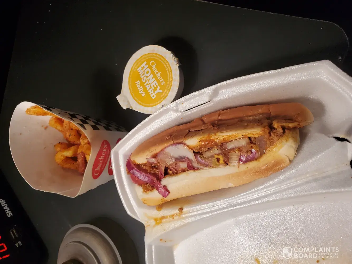 The pictures included with this grievance is one more time my order is not only wrong, this time I was given a checker burger with a bite taken. The spicy chicken I ordered with no mayonnaise. It had mayonnaise (again). I did what I normally do, eat just the chicken with the bottom side of the bun since it doesn't have mayonnaise. The burger is absolutely inexcusable.