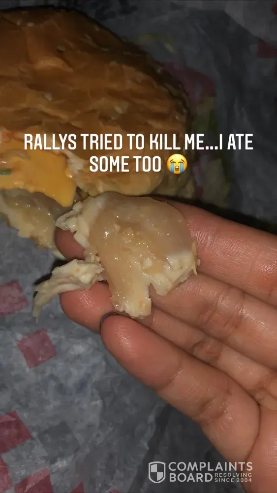 I usually been going to this Rallys for years and I ordered my go to chicken sandwich. The outside was a bit warm but when I bit into it, I noticed that my sandwich was still cold and slimy. I spit it out before I swallowed and realized that my chicken sandwich was not cooked all the way. I feel nauseous thinking about it now.