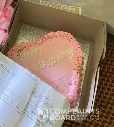 STAY AWAY, searched for gifts to send to chennia, a birthday cake, flowers with balloons and a card, the recipient recieved a plain cake no writing on it, no balloons, this is part of the transcript of several complaints with a reason why happy birthday isn't written on the cake and a refund of 50 rupees for the ballons..