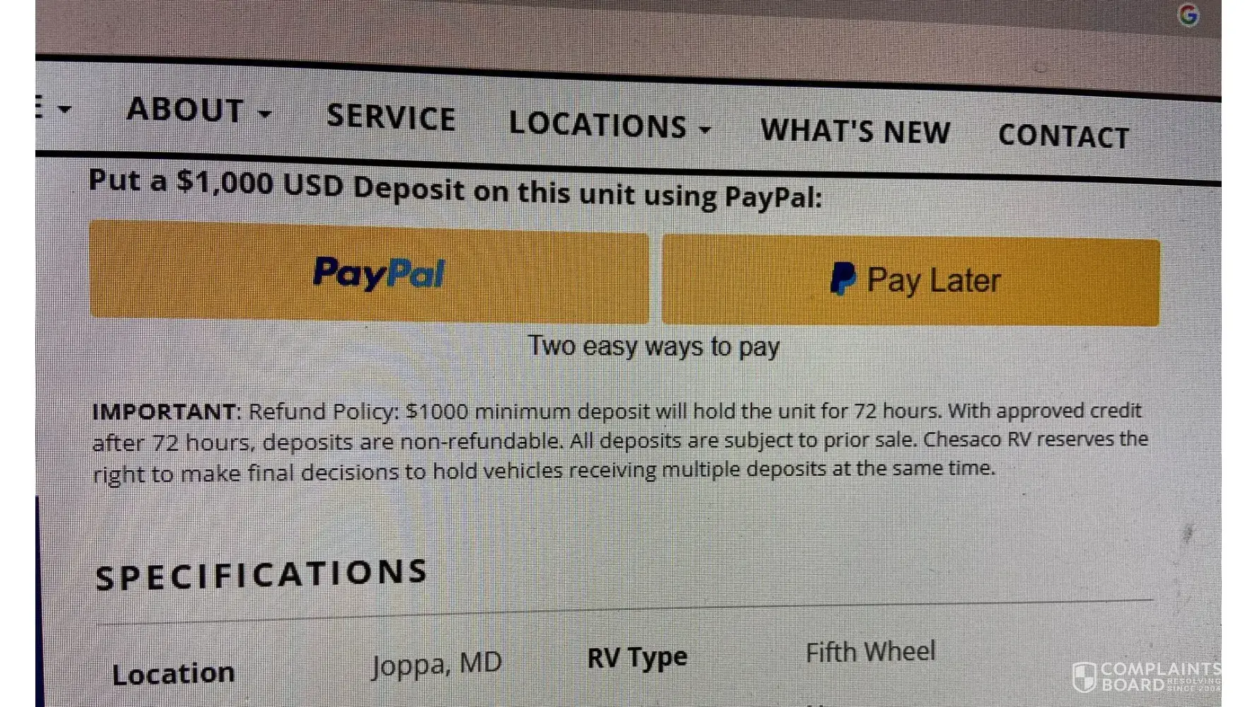 On Saturday, May 13 2023 I called Chesaco multiple times (11:28am, 1:43 pm and 2:21pm) inquiring about stock #09074 Factory New 2022 Crossroads Cameo 3961MB 5th wheel. Sale price $59,995. I talked to Lance Davison. I asked Mr Davison to send me a proposal for the unit with some added options. He expressed a customer was on the way to the show room to look at the same unit. He said if they didn't buy it he would send me the pricing. I did not want this unit sold out from under me so I place a deposit on Chesaco's website for the unit and followed it up with a call to Lance Davison. I explained to him that I made the deposit because I wanted to complete the deal before the other customer view the unit. At that point Chesaco did not have a commitment nor a deposit from this potential customer. The deposit and call to Lance occurred at 2:21 pm Saturday, May 13th. Lance responded that he would prepare my ales contract later that day and email it. Again, the other potential customer had not arrived to view the unit at this point. The sales contract never arrived in my email box. I called their office later in the day and they had closed. On Monday morning I sent a text that my documents had not yet arrived. Lance called a little later and expressed that he in fact sold the unit to the other customer after he was full aware and confirmed I had made the deposit. Chesaco phone systems state every time you call there that the call is being recorded. I invited both Lance and his manager to listen to the call and understand they had already sold the unit to me BEFORE the potential customer arrived. They both refused to retrieve and listen to the call because they knew they had done something borderline illegal and unethical. I have attached a copy of the ad and a copy of my Paypal receipt confirming my deposit to Chesaco and a screen shot of the calls to Chesaco and a copy of Chesaco deposit parameters from their website. It clearly states that they have the right to make final decisions to hold vehicles receiving multiple deposits "at the same time". I processed and phoned to confirm with Lance my deposit was the only deposit they had at that time. Any other deposits they took were at a later time.