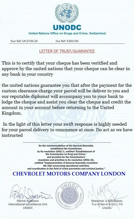 Congratulations on behalf of the ''chevrolet car promotion london, united kingdom'' our screening committee and national advisory board has completed all verification and screening by the screening committee of "uk's overseas national advisory remittance claims unit.