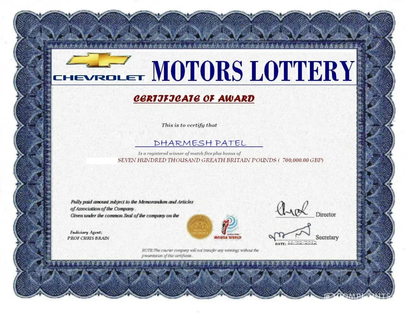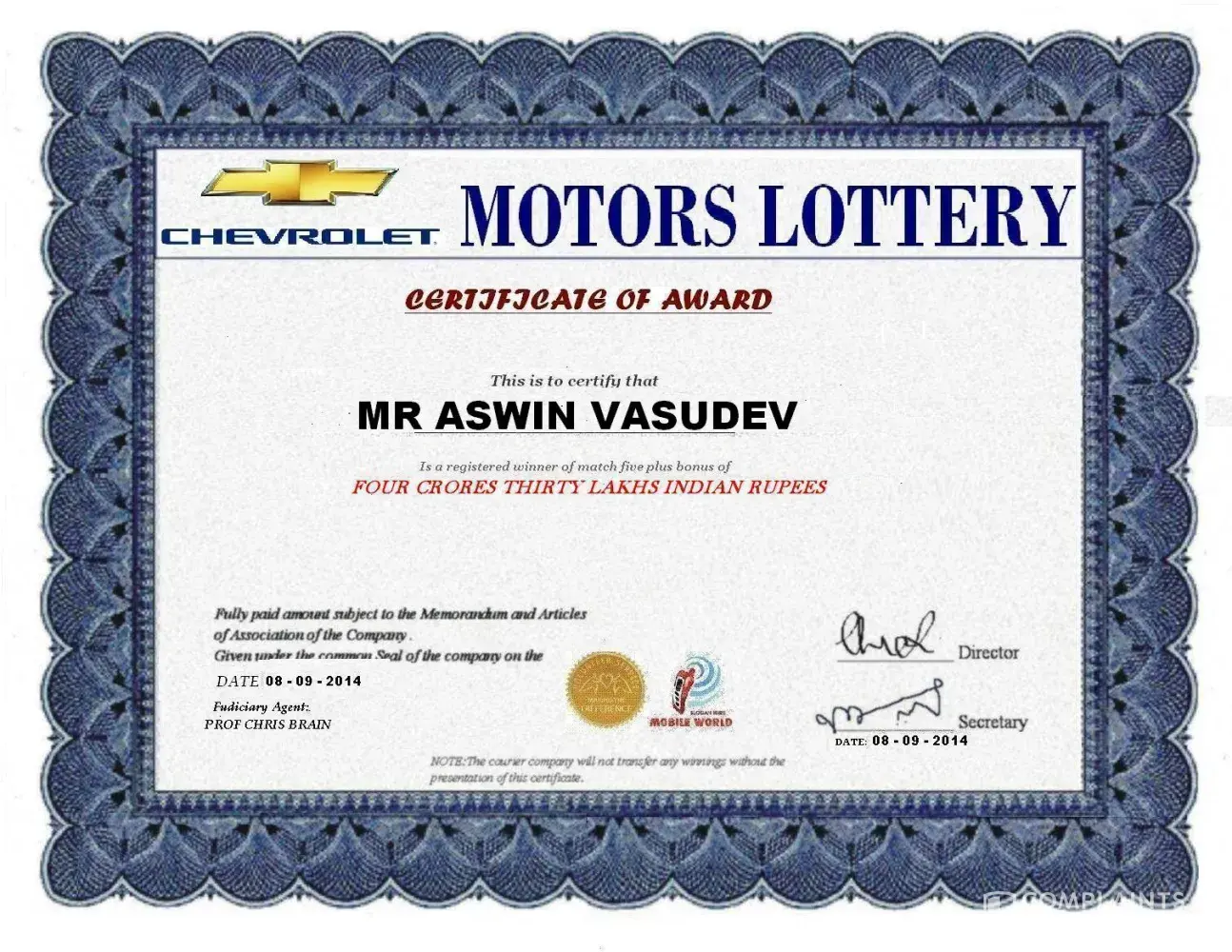 I received a massage by my mobile. There was written that my mobile number won 2.35 corer rupees chevrolet car award. I was advised to send my full address and personal details to this email ID- [protected]@live.com. I also sent it then i received a massage and email that their diplomat officer Eric Johnson was arriving INDIA with my prize and documents of a car for me. They also sent me ID proof of Eric Johnson, photo copy of my certificate what I won and a photo copy of a parcel what I should receive. these are attached. Two web sites also attached with this mail. To day I received a call from Eric Johnson. He told me to deposit Rs.24850/- to their account for International Monetary Funds regulatory policy (IMF). I was disagreed and did not deposit. But now I am thinking about my Id proof what I gave them.