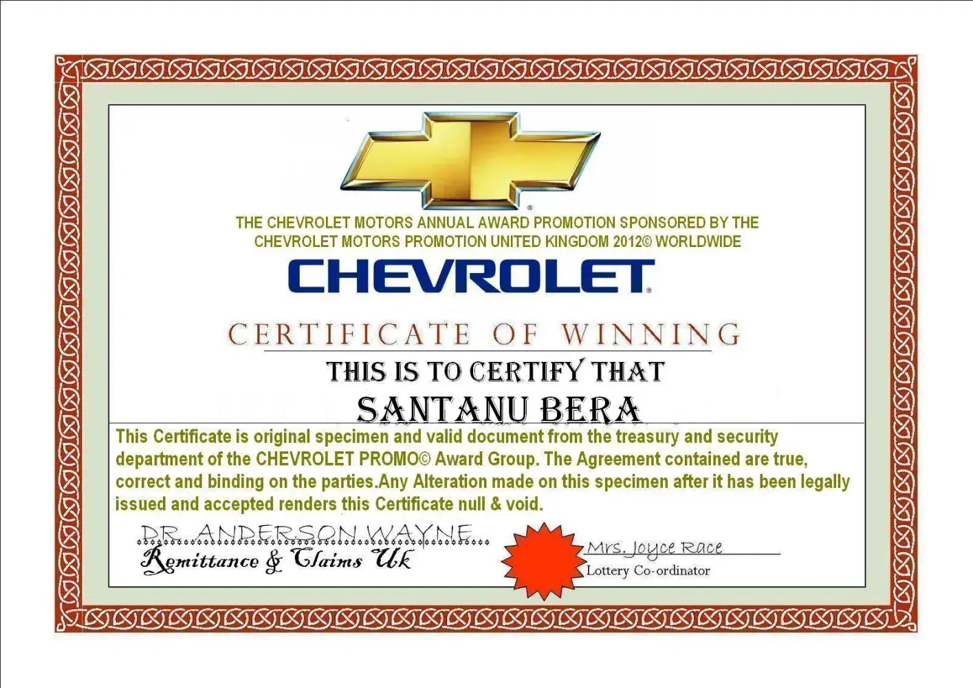 Msg regarding winning of chevrolet car and cash amount came to my mobile and asked me to send my name and mobile number to [protected]@yahoo.com and after tat i got a reply frm them tat your informations are all verified and asked to give extra informations like id proof, account number etc as mentioned by them in the mail they have sent below
