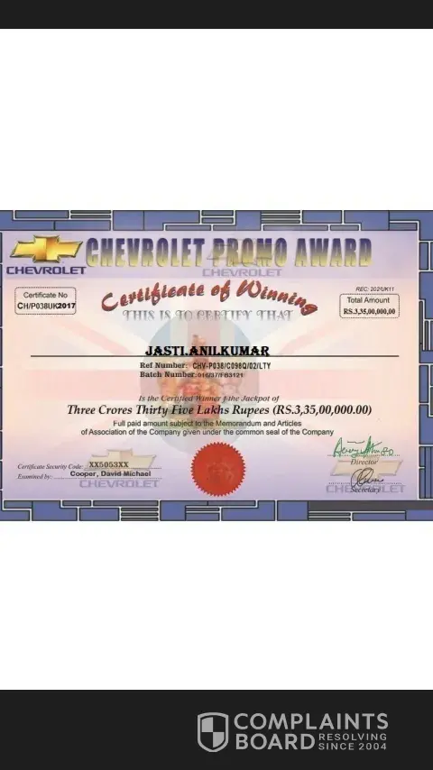 I got a fraud eMail from you email that I am a lucky winner and they had access all my details and bank documents if any fraud will happen then I will fire a court case on Chevrolet .