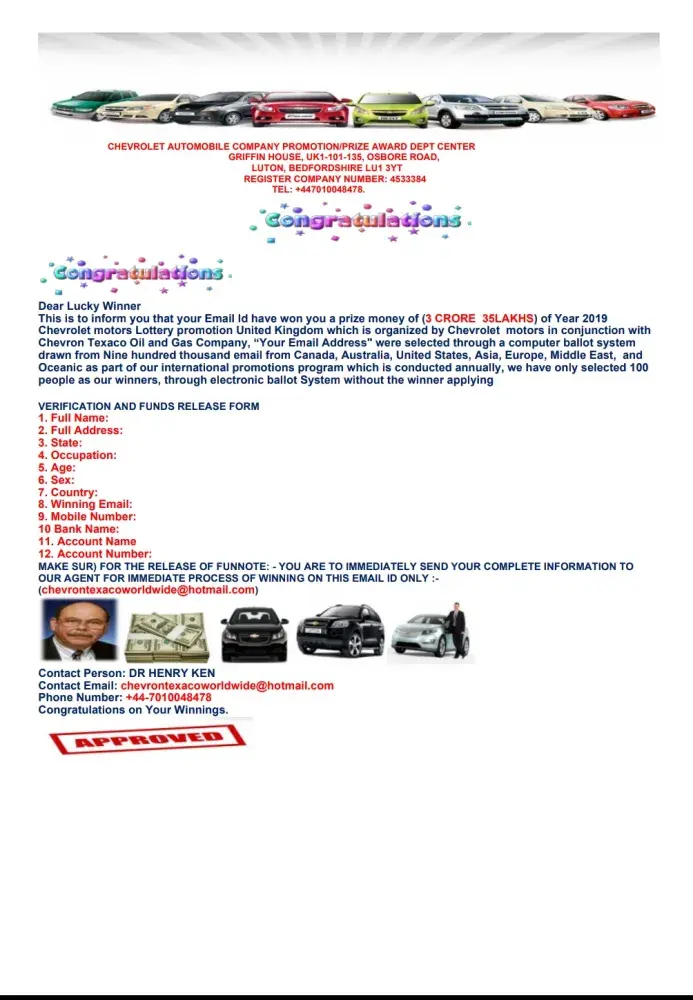 We are officially announcing to you the result of CHEVROLET MotorsEmail Lottery Promotion held on the 8TH AUG 2008 as part of ourprograms to Launch our new office that was commissioned on 1ST of AUG2008 in Manchester United Kingdom. Your email was attached to ticketnumber CHEVROLET-UK-CP8XC098372N with draw number Z93BL whichconsequently won you in the 2nd category prize, your email address was extracted from our electronic email extraction system which randomlyselected Eleven (11) Lucky Winners of which your email address was among one of the lucky winner. You are therefore been approved for a payout of a total sum 450, 000 GBP And a brand new CHEVROLET CAPTIVA CAR(FOUR HUNDRED & FIFTY THOUSAND POUNDS & A CHEVROLET CAPTIVA CAR).