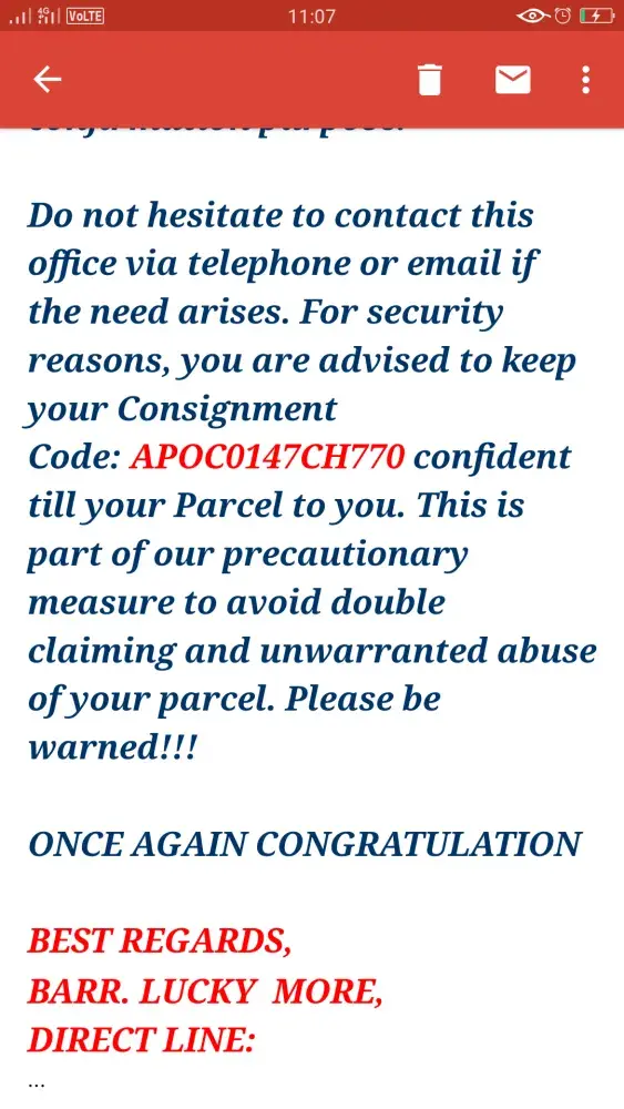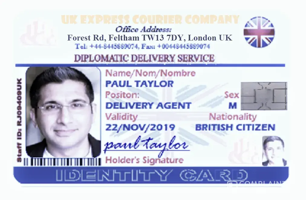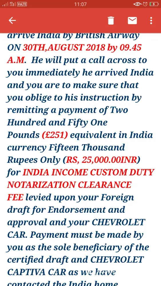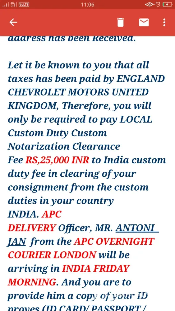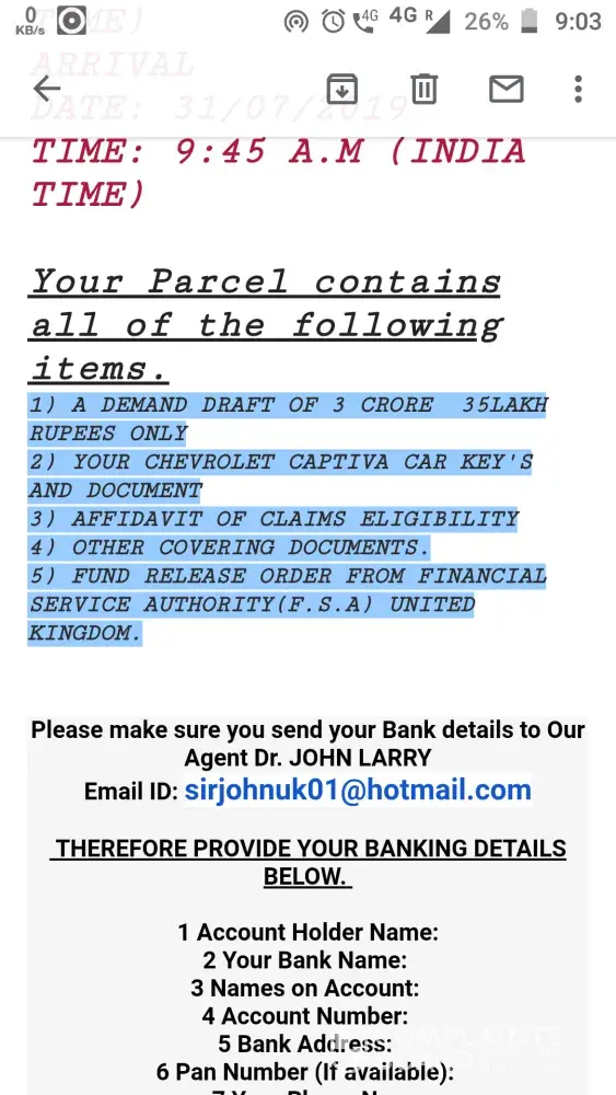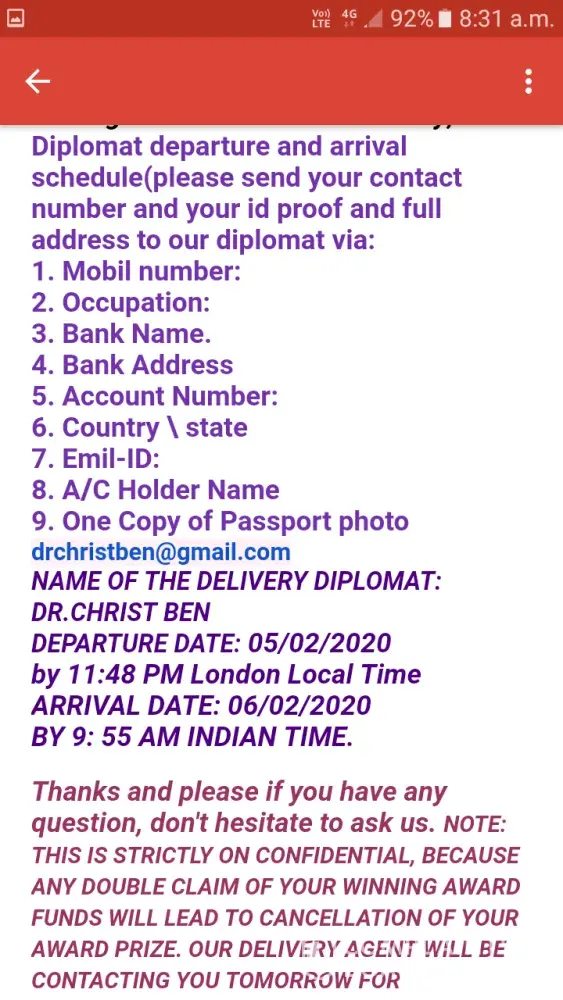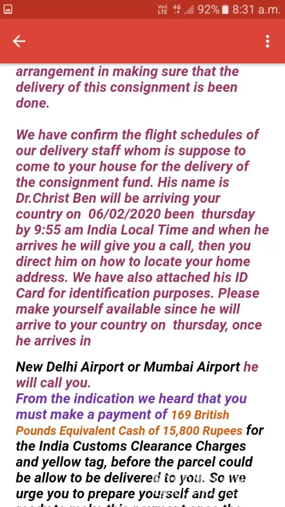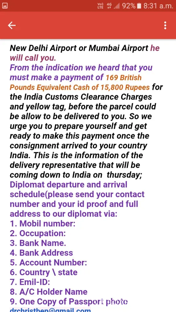 We received and have noted your delivery address sent to us. This is to bring to your notice that you will be receiving your parcel in India, this office will be sending a diplomat from UK to India for your delivery, Our delivery Diplomat by name, Diplomat John Williams will be leaving from England and will arrive your country on TUESDAY Morning 03/08/2019 in NEW DELHI (INDIA)