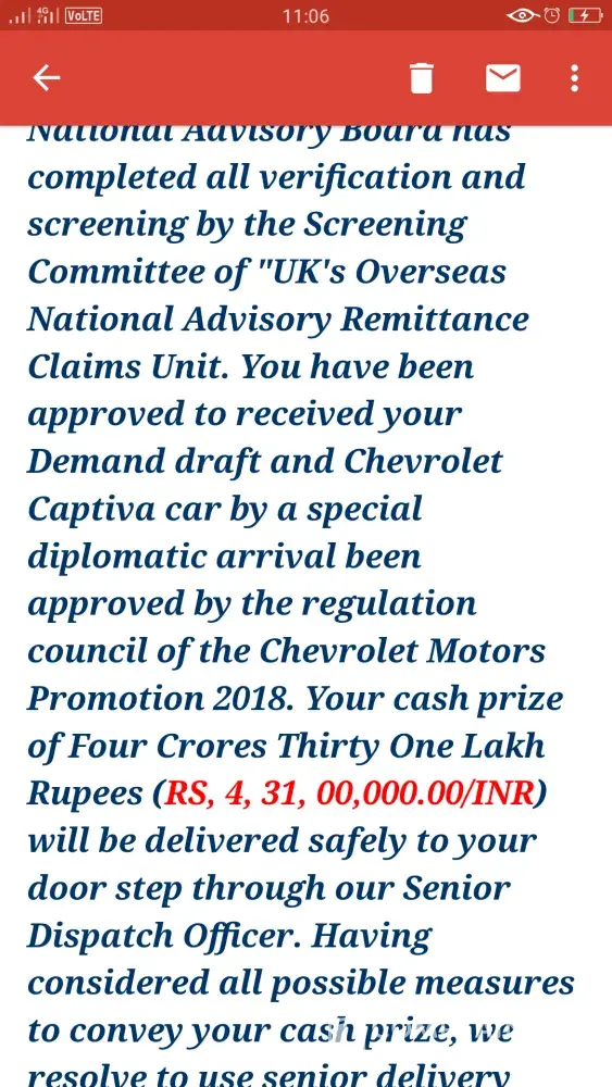 This is to inform you that your email have won you (3crore.35lakhs rupees) and a brand new (chevrolet captiva 2019 model car)