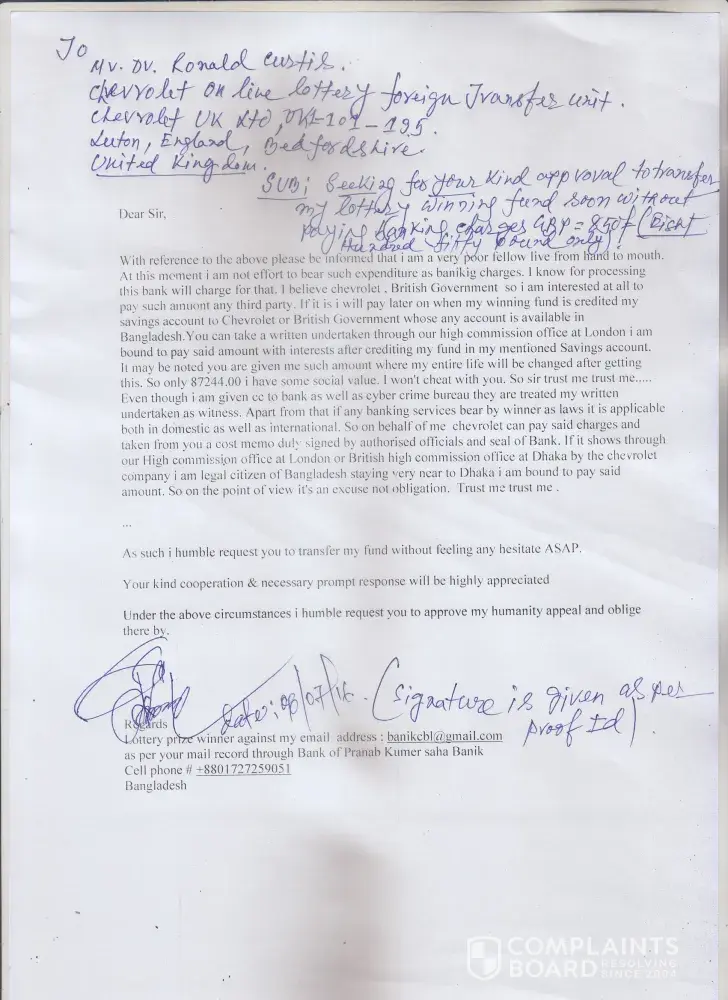 Chevrolet online lottery Chevrolet uk ltd. Uk1 - 101 - 135 Osborne road Luton, bedfordshire lu1 3yt. United kingdom. Winning notification This is to inform you that you have been selected to receive the award sum of £500, 000. 00 (Five hundred thousand pounds sterling) from the chevrolet 2009 award donation. All beneficiaries email addresses were...