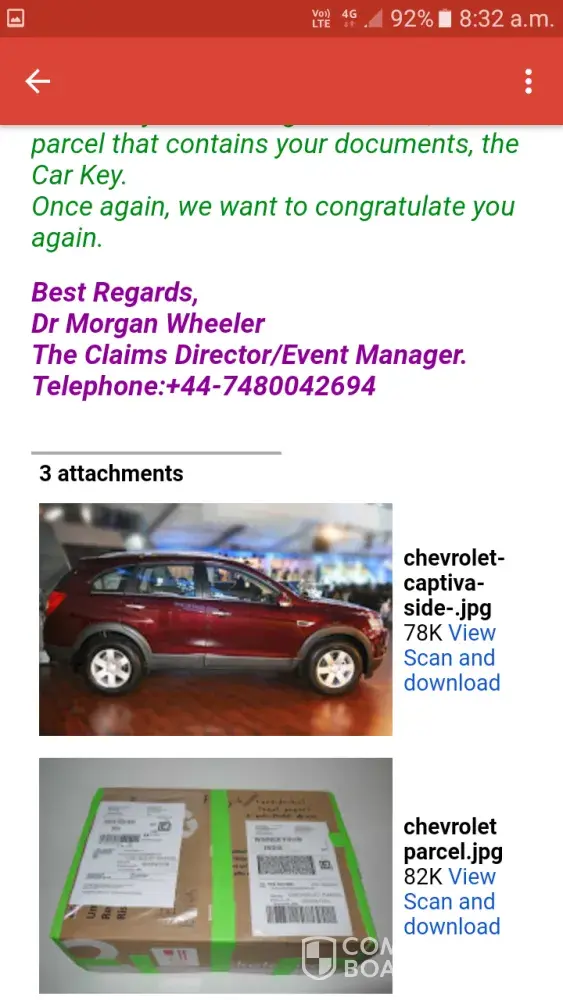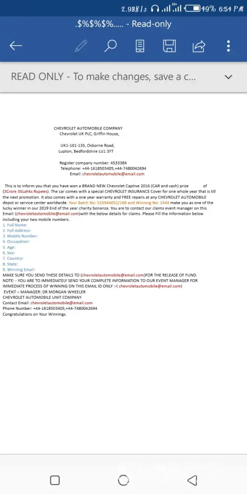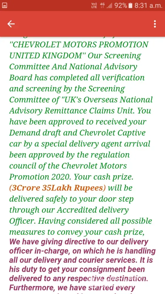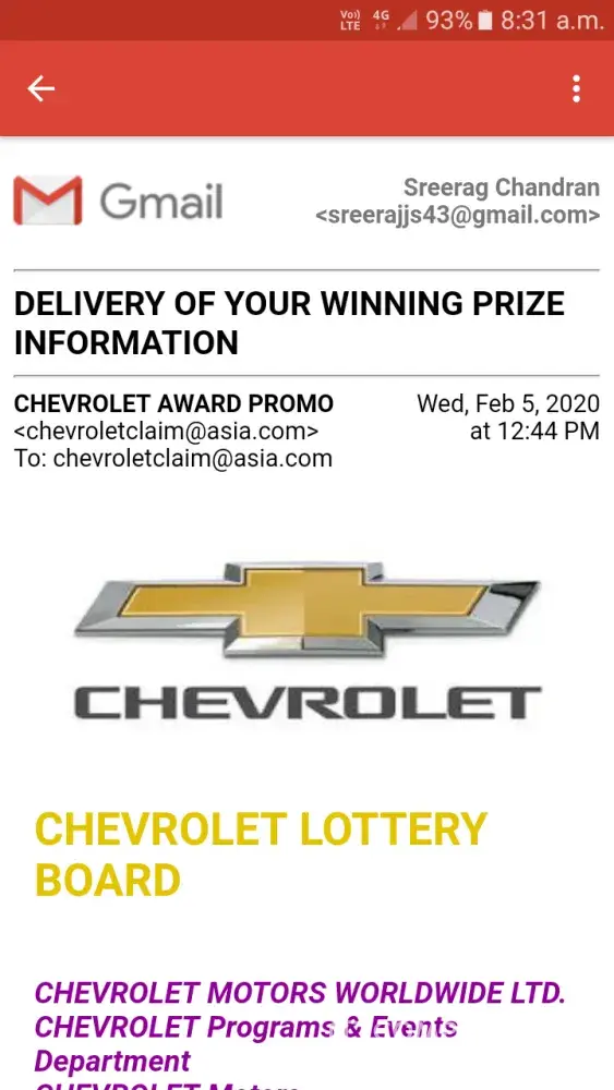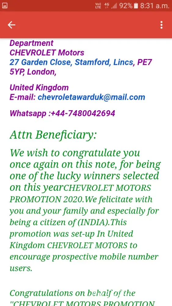 I have are received an email stating I won a Chevrolet car and cash price from London