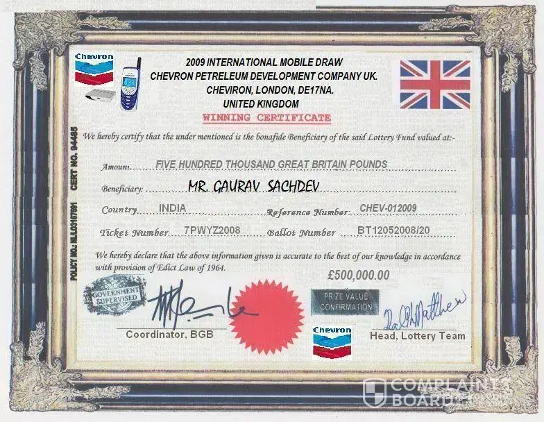 I recived a massage in my mobile no [protected] that my mobile number has AWARDED of a Grant CASH of $2 Million Dollars for claim at Claims_chevronte xaco2011@live.com. Massage recived from BA-goodnews. my Email-Id is palprem51@yahoo.in