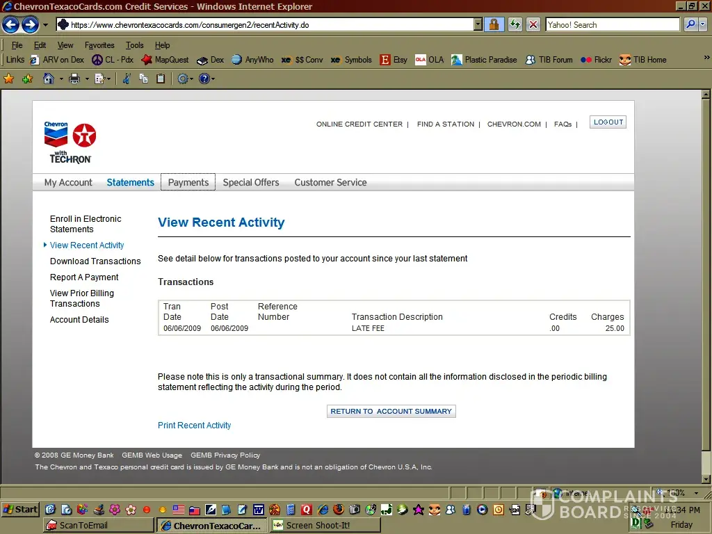 A screenshot made tonight when I discovered the late fee being assessed in advance of the due date is attached. It clearly shows it to be 11:34 pm on Friday (although it doesn't show the date, trust me, it was moments ago), with a late fee having been posted on 06/06/2009 in the amount of $25.00.