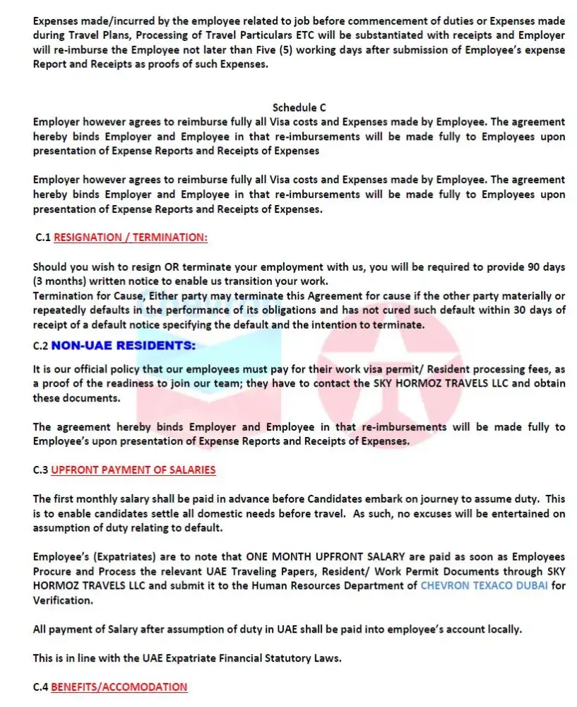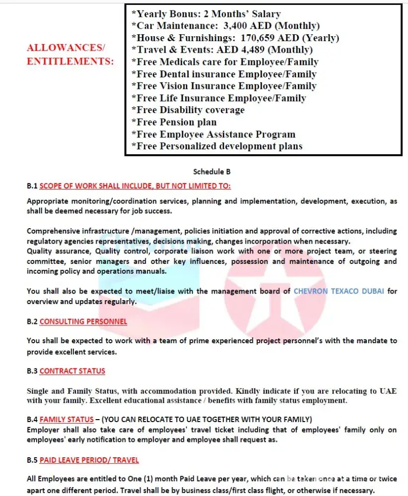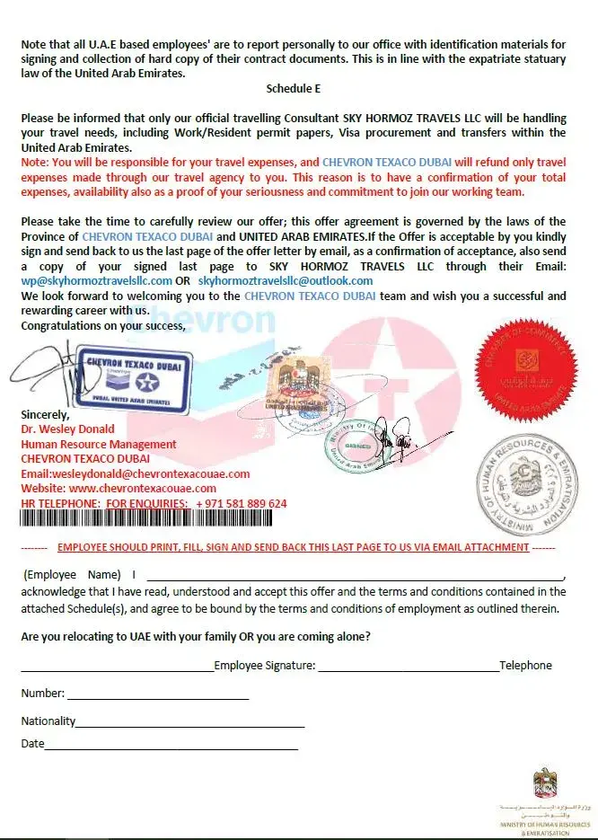 I was approached by Wesley Donald from Chevron Texaco Dubai, confirming my job application as Operations Team Lead in Dubai.There was a contract given to me asking me to join them in dubai by 13 June 2022.