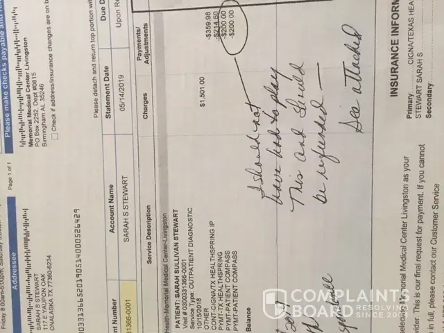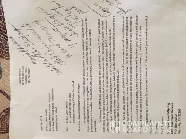 I have contacted and spoke with my insurance, Cigna-HealthSpring, and specially with ChI St. Luke's Memorial Health Center (4 separate times) of Livingston and written two (2) letters regarding where I accidentially paid for my preventive care services performed at the CHI St. Luke's Memorial Health Center in Livingston. Cigna HealthSpring say I do not owe...