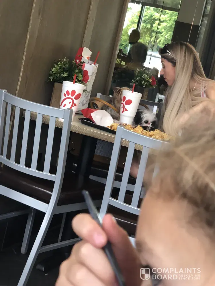 This was at the Evans Chick-Fil-A today. I'm tired of people treating their pets better than their kids. This lady got up and left 3 small children, 1in a high chair alone, but made sure she took her not one but 2 so called service dogs! It was disgusting eating and having those dogs at the table across from us. Enough is enough. A real service dog would sit at the foot has his master and not eat off the restaurant table. The workers actually engaged in conversation to say how cute! 🙄😳