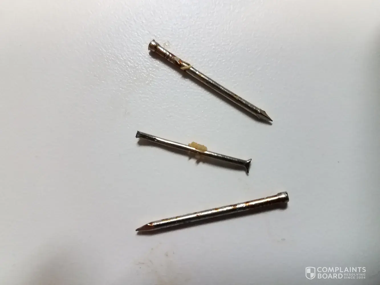 By looking at the attached photos you will see what appears to be three metal objects (presumably nails) which were found in two chicken breasts. I found one of them just before taking another bite and after inspecting the remaining pieces found two more.