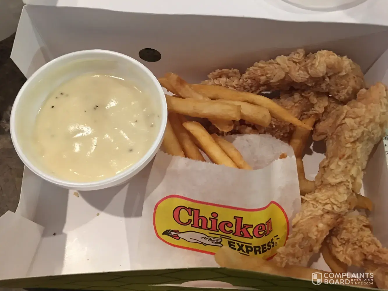 Hello i went to the chicken express in lubbock texas on 82nd st. I used to love chicken express and I havent been in awhile. I ordered two 4 tender combo with fries and a roll. I got home and the chicken seemed old and cold and the fries were worse the only thing good was the roll and the gravy. I spent 16 dollars I thought about calling the store but there was nothing but young kids working and I was scared it might not lead me anywhere. Below i have attached a picture me or my friend could not eat our meal this is how bad it was. I hope this can be fixed as i am a lover of chickwn express and they disappointed me this time. Thank you.