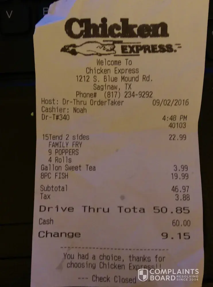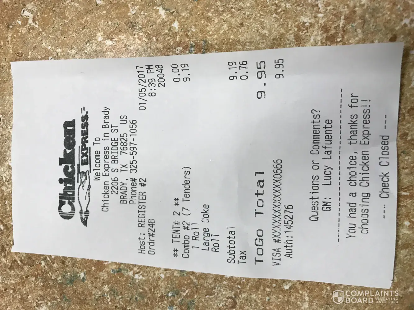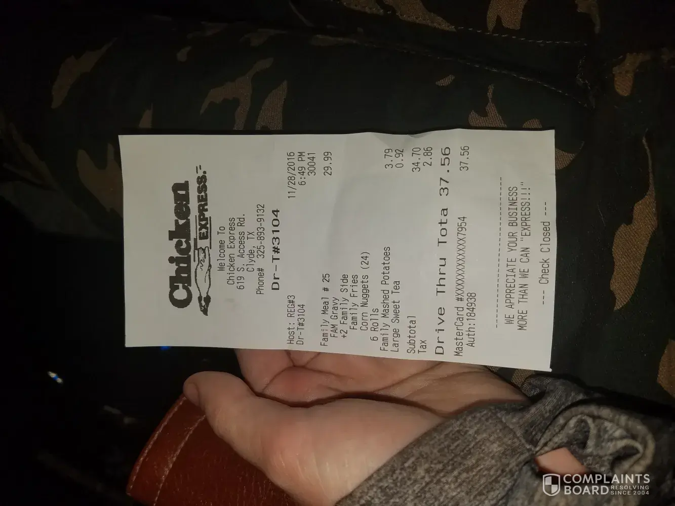 My husband went to the chicken express in irving off 183 & order the 20pc. Tender family pack. Rolls & mash potatoes. What he brought home was a small order of big whole pieces. Legs & thighs. Biscuits. & no mash potatoes. I called a guy who called himself kevin & told him my issue. All he could say was "oh. Ok" there was no care or concern or attempt to resolve or compensate my family at all in any way. I asked him for a corporate/franchise number & he gives me this number : 817.368.7261