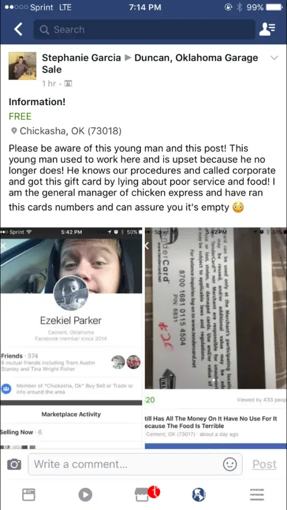 The general manager of the chicken express in Chickasha has slander my son over a gift card on fb and buy sell sites. Her name is Stephaine Garcia and she has posted my 16 year old