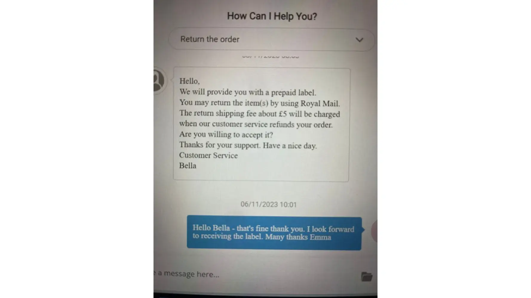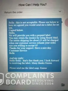 Customer Service then said yes I can return and it will cost me £5 which I agreed to and asked them to send the post label to which I was then told in the next message that sorry, I was out of the 14 days which was completely due to the numerous messages from their customer service team continuously trying to get me to keep the clothes.