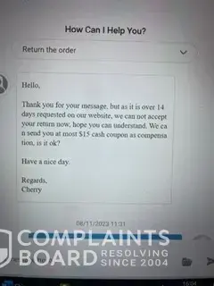 I ordered some clothing form your company, the product arrived on September 25th, but they did not fit, I started the return process on September 26th, I first was told I would get $ 5 dollars or a 10% discount. I responded that I did not want to keep the product because they did not fit but would like to get a full refund. At this time, I was supplied with a return address, I responded, that the labels have been removed and I was told I was not eligible for a return because of the labels have been removed. On October 6th I stated since I cannot get a full refund, I would like to get the 30% refund at least. At this point I was told I am no longer eligible for the discount because I waited too long to respond the 14 days and the refund was no longer available. I received the items on September 25th and started the process for the return or refund on September 26th and the last conversation about getting a refund was on October 6th! How is this 14 day?