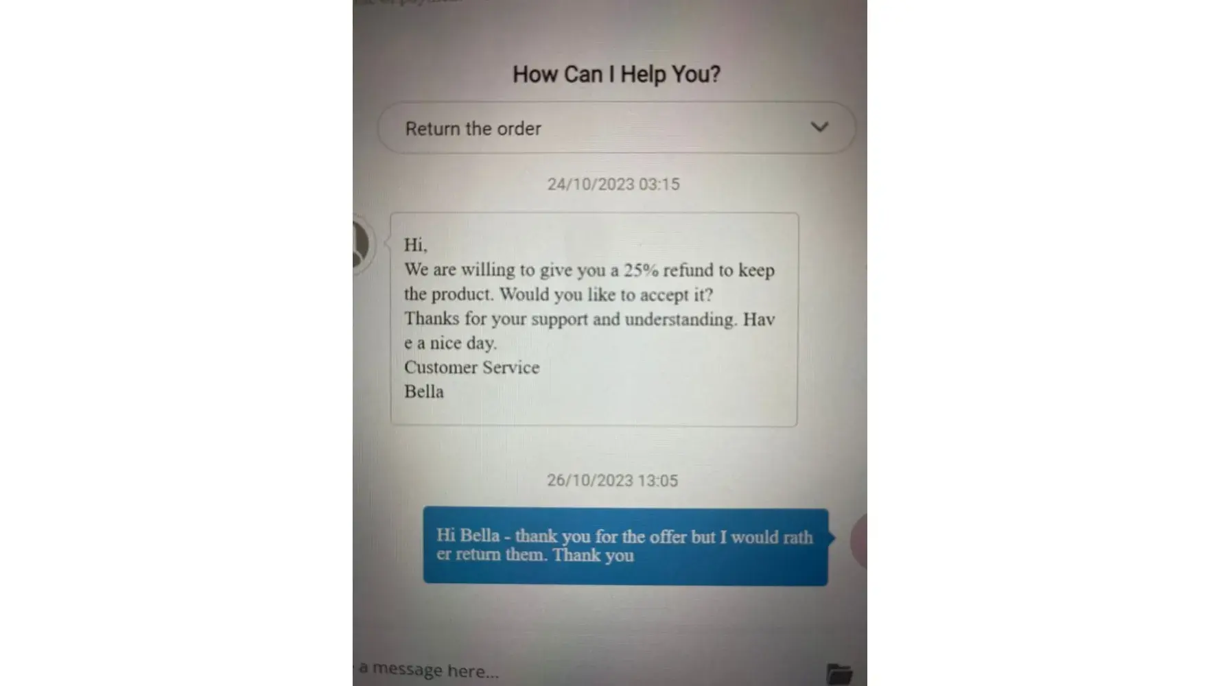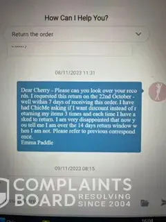 ChicMe customer team then wrote to me to offer me 10% to keep the items to which I said I wanted to return still, then the next message they offered me 25%, I still said I wished to return, then I received another message which offered me 30% to which I said no, I still wished to return.