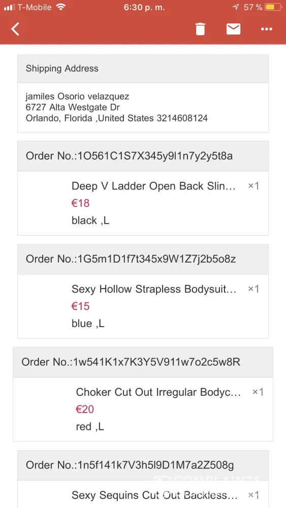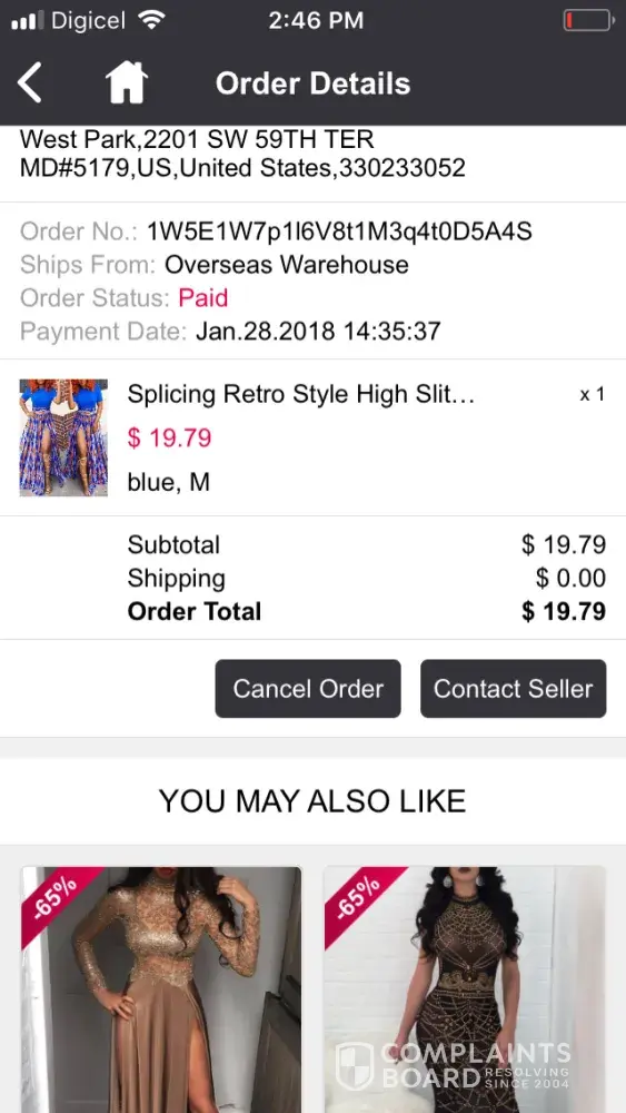 Hi Do you mean this? Order No.: 135z16260r5G3K2h3U2L03022P Tracking No:HKAETA31237811 Ships From:Overseas Warehouse Order Status: Order Confirmed Time of payment:‎2017‎/‎11‎/‎30‎ ‎04‎:‎48‎:‎00‎ ‎PM Rhinestone Embellished Split Sleeveless Maxi Bodycon Dress $39.49 XL, black x1 Review Share