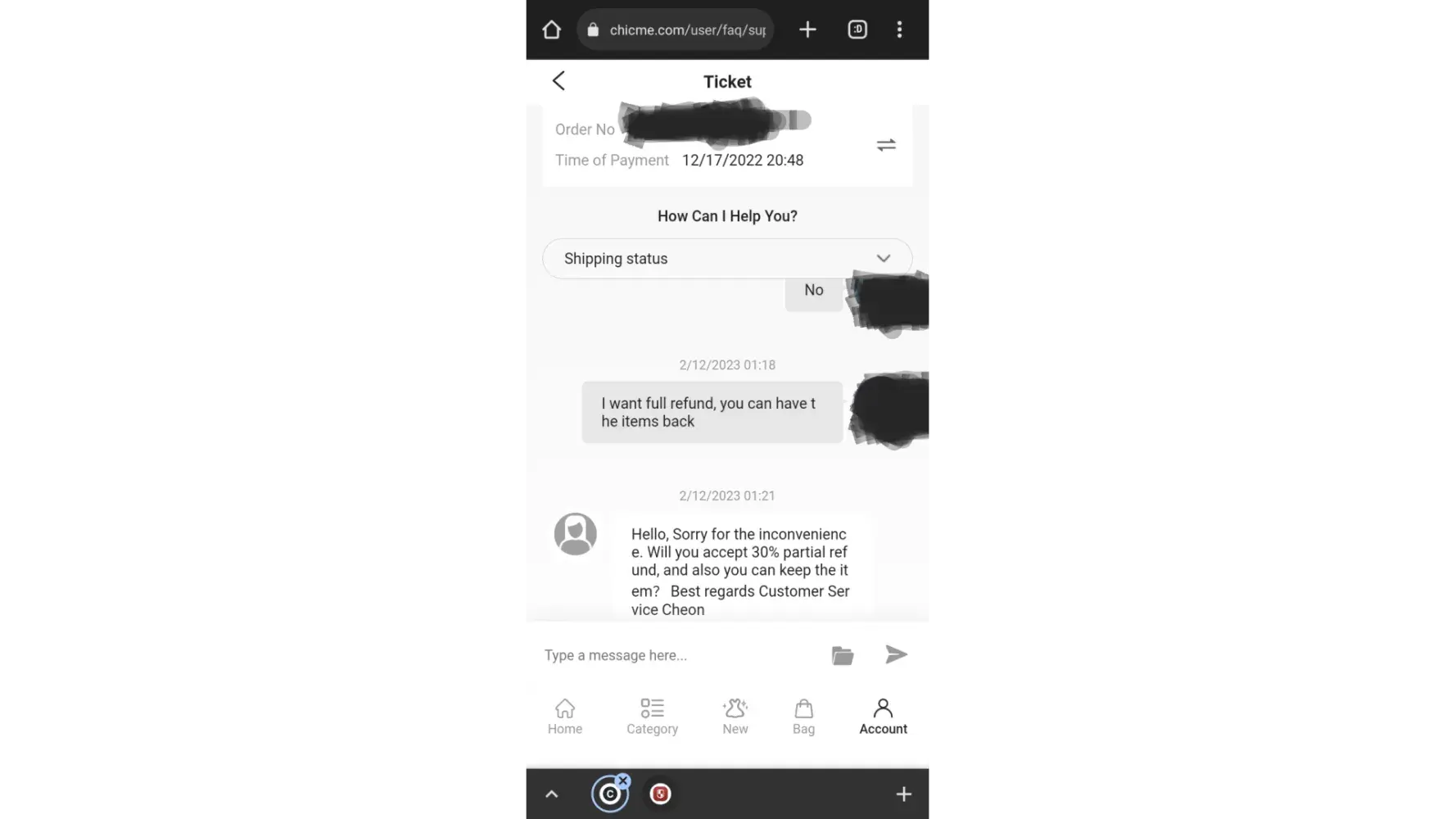 I ordered from chic me before Christmas 2022 it’s now the last day of January 2023 not only have they sent me some random ball of fluff in a delivery bag with my name on it but they have been back and forth with me about fixing my order for weeks, their now telling me half the things I ordered are not in stock and never will be again I’ve requested a refund multiple times and they keep responding with other options ! This place is a scam I didn’t get my order and they won’t give me my money back !