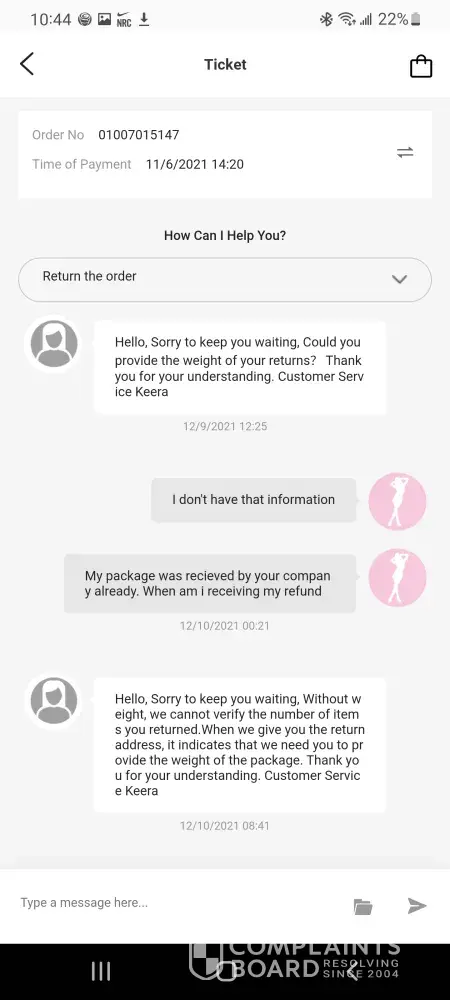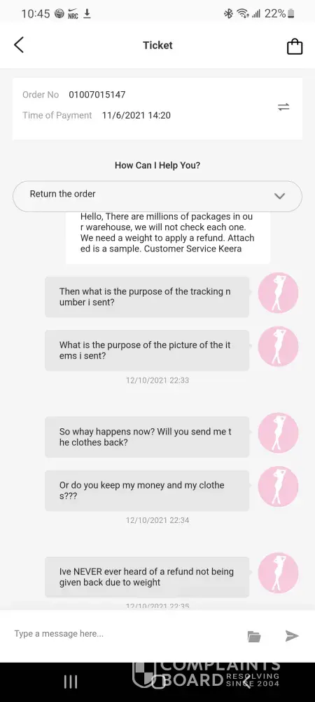 Ordered clothes from them that was my size, but when I got the clothes they were very small but supposed to be a large. I requested a refund because I knew I couldn't fit them just by looking at them… when I requested a refund, they said that I couldn't get my money back but I could get something else.. it's very hard to speak to anybody live and even in chat.. someone supposedly from the company was messaging me through Facebook messenger.. you can't get anybody to speak to at this clothing store or whatever it is.. I took my package to fed ex and got a tracking number and it appeared that the returns things were with them… I ordered something else and I've been waiting several weeks to get my items.. the person I've been talking to through messenger contacts me at all times in the middle of the night but shows this person be in Facebook during the day but won't respond to me until late at night…. This clothing store is horrible with bad customer service and bad quality/ too small clothing… I hate I purchased anything from them, this is very frustrating that I can't talk to anybody via chat or live..
