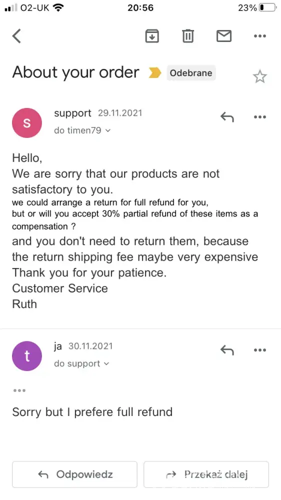 Desired outcome: Full refund- pre paid shipping