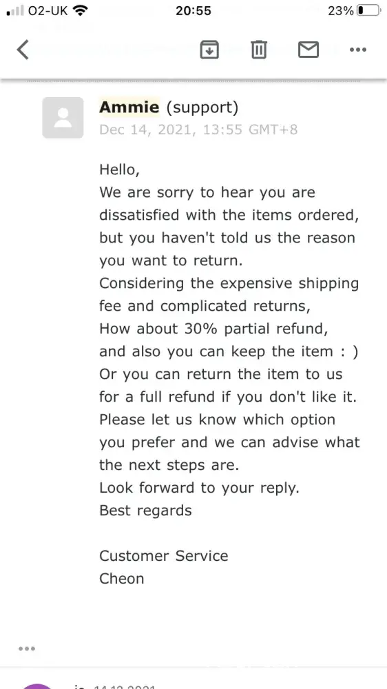 Eventually the clothes came and they were all terrible and absolutely nothing like the pictures online. I asked for a refund back straight away. I used their email function and their WhatsApp chat function as their online chat never works. I was told numerous times that the return shipping me was so high that I'm better off not returning the items. I was so upset and angry as the website clearly says easy returns etc. This is completely a lie as nothing is easy about this. I kept saying I want a return as over £300 is a great deal of money and the items are of terrible quality there is nothing I can do with them at all. They then said well you will pay a lot if shipping take 10% return price. I said absolutely not I have never heard of such an offer and they keep insisting on this offer on all of the channels and ignoring me. This company is clearly a scam and have made up false claims on their website for people to buy items like the returns are super easy and then make it so hard to do so that people give up.