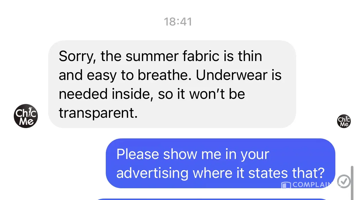 I have had the misfortune of purchasing of this company. After paying nearly $400 to them for items of clothing and having to chase them to find out where the items were as they sent me no shipping information or confirmation of order I finally received my items. Upon opening all my items I realise they were all transparent and extremely poorly made. Every single item I bought was see-through and the worst quality material I have ever seen. After going back-and-forth with the company on their Facebook page, they openly admitted (attached is a screenshot of their comments regarding the quality of all their clothing I purchased) that they sell transparent clothing that requires underwear underneath it for it to not be see-through. I requested a refund and would happily ship these items back, they then informed me of an address that I needed to send items back to and the method in which I needed to send it which included tracking and appropriate shipping containers. All up it was going to cost me over $120 to send back items that they knowingly sent that were poor quality and not as they advertised. Do not buy from this company they are rip-off merchants. They sell absolutely rubbish for premium prices. They have tried to offer me coupon codes such as a five dollar off my next purchase or a 10% off my next purchase as compensation for this. All I want is my money back because I cannot wear items that are completely see-through on a day-to-day basis. I don't know too many people that would be comfortable wearing $400 worth of see-through clothing to work or to the shopping centre. This would be one of the worst companies I have ever dealt with. I am fortunately used after pay to pay for this purchase and not Paypal, I've lodged a complaint with after pay and they are investigating it so I can only hope that I can get my money back