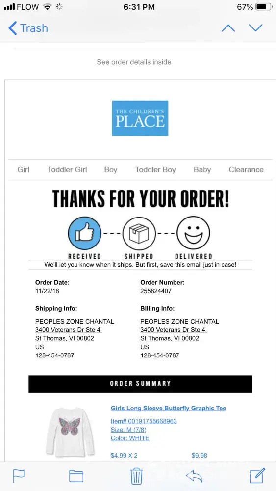 You: hi i ordered recently from childrensa place