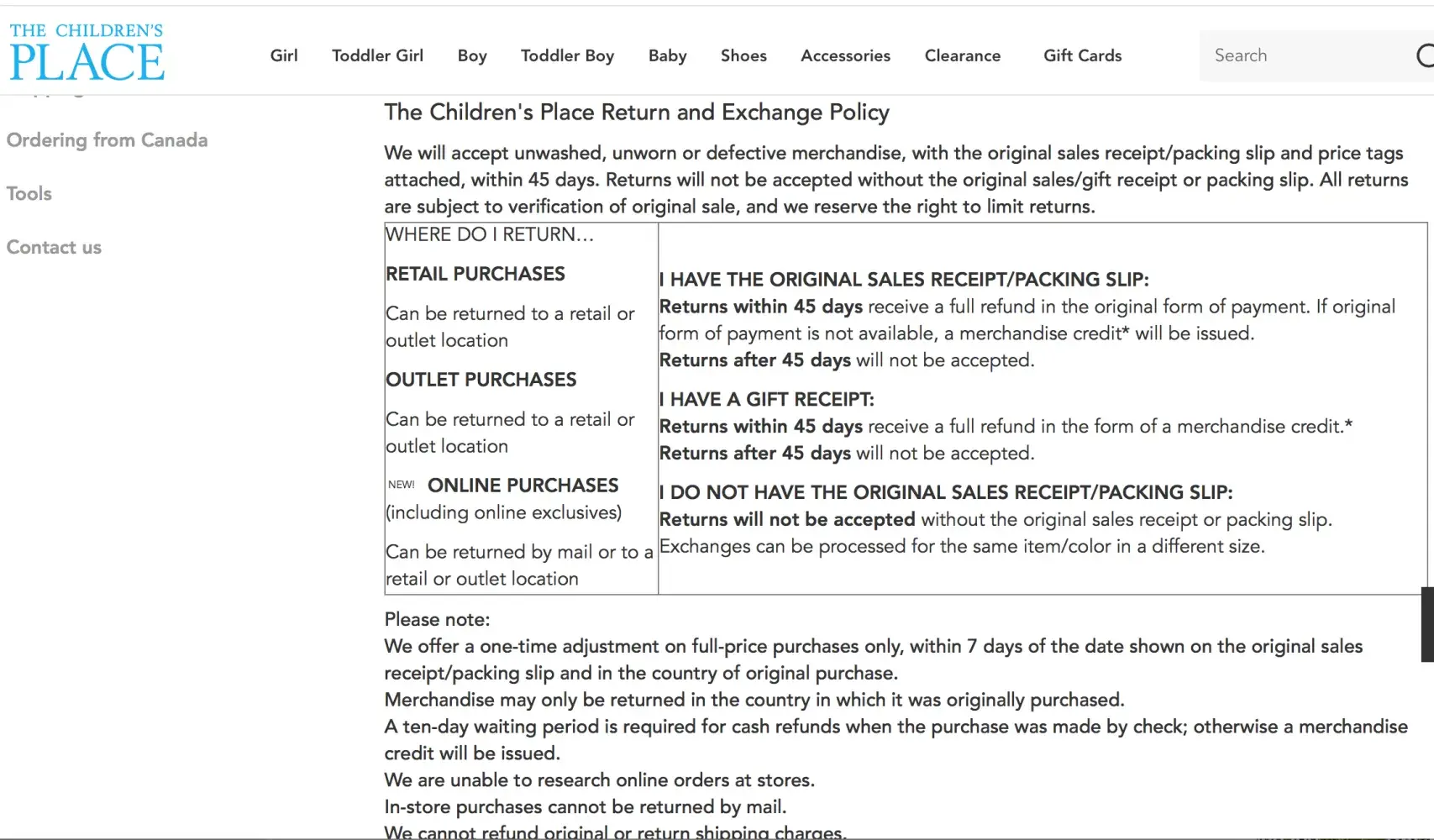 Incident: My mother, who lives in Texas, purchased school uniforms for my children at The Children's Plan and gave them to me as a gift when she visited me in Chicago. When I received them, I had my children try them on. The regular sizes at The Children's Place no longer fit my son. So I ordered husky sizes for him instead Order number [protected] and [protected]. Once I received the orders for the husky sizes and confirmed that they fit my son, I planned on exchanging the regular size 12's that didn't fit for the husky size 12's that did fit. I live downtown Chicago and there are no longer any stores in the downtown area. So I searched for the nearest store locations and while doing so noticed the low customer ratings that related to stores not accepting returns/exchanges. So before I drove out to the suburbs I wanted to confirm my exchanges would be made without incidence and contacted their customer service department. I was told that even though their return policy states that exchanges could be made for the same item/color in a different size without a receipt, my items could not be exchanged since I didn't have the receipt and husky sizes weren't sold in the stores. Their return policy doesn't state that the stores will only honor returns for regular sized children and if your child wears a husky size, the return/exchange will not be allowed. I would have expected them to return my unworn, regular-sized items with tags attached for a merchandise credit and then use that merchandise credit to place an online order for the correct size.