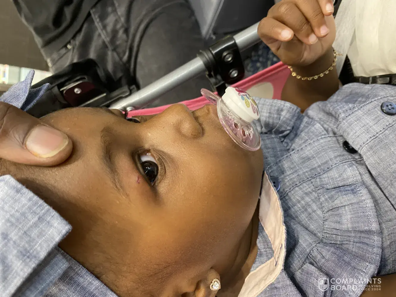 My 1 1/2 year old daughter was in her stroller in front of me while I sorted through clothes. As I leaned over the table to check for her clothes a sign fell down and hit my daughter in her right eyelid. She has a scratch on her eye that was bleeding at the time of the incident. With so much rage I rushed out of the store to attend to my baby. She is okay, however that sign should have not been there and this situation could have gone a completely different way. My daughter could have lost her eye or her eye sight. I am not pleased with how this sign was just sitting there on the edge of the table so carelessly. Anyone could have knocked it down. Especially a toddler who was not in a stroller. I will not take extreme measures at this time because everything seems okay but I wanted to complain about the workers who were in the store at the time it happend. That sign was in a dangerous place and it could have hurt anyone.
