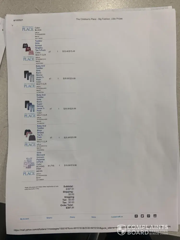 I had 2 orders but I am concern about the one that arrived August 6, 21 at 2:57. It was delivered by USPS. When I received my package it was already opened upon delivery. Everything was gone for the exception of 2 polo shirts and a Dino blue sweater. There was no receipt of anything for the exception of a package that included Doordash, KiwiCo, Shutterfly, and Geico. I am 76 yrs old trying to buy for my great grand for his 1st day at school, which is tomorrow. I called UPS, USPS, and most of all The Children's Place. The said the couldn't help me. I questioned my mailman and he said it was opened when it was delivered. I will never do anymore online orders. I was more than disappointed.