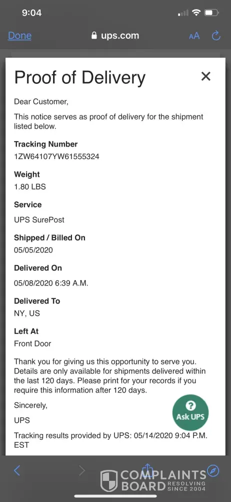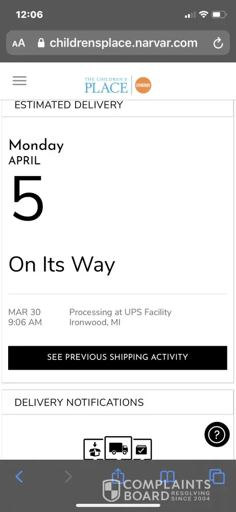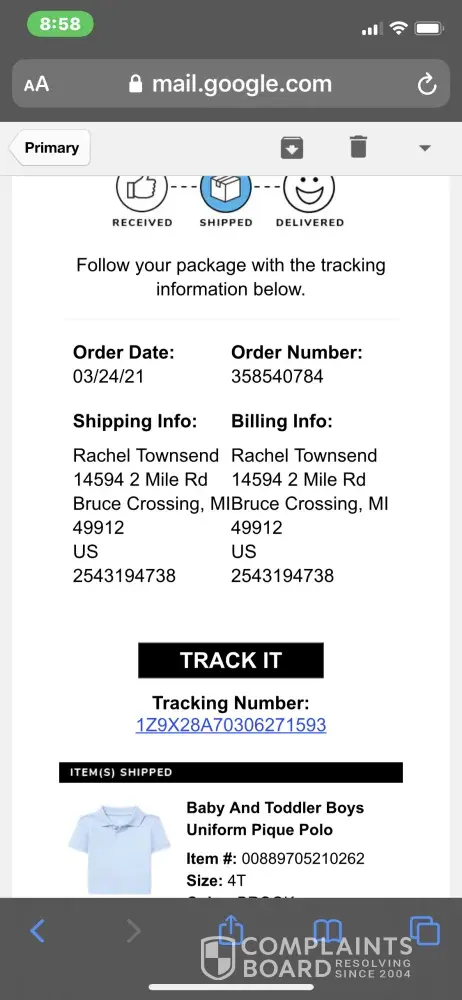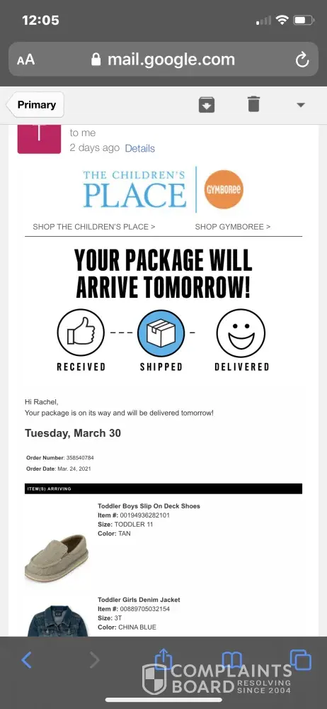 I am complaining because I ordered an Easter outfit for my child on March 24th and yesterday, March 30th I received an email that it was arriving that day, when I tracked the package it was in ironwood MI which is an hour away from me. I never received the package and when I called about it today, March 31st they said it was now in Maryland and I would receive it until Monday, April 5th, which is 12 says since I ordered it AND the day after Easter! I am extremely frustrated and disappointed that this happened! now I have very little time to try and find my son something to wear for Easter. I honestly would like something to be done about this. How stressful, frustrating and disappointing!