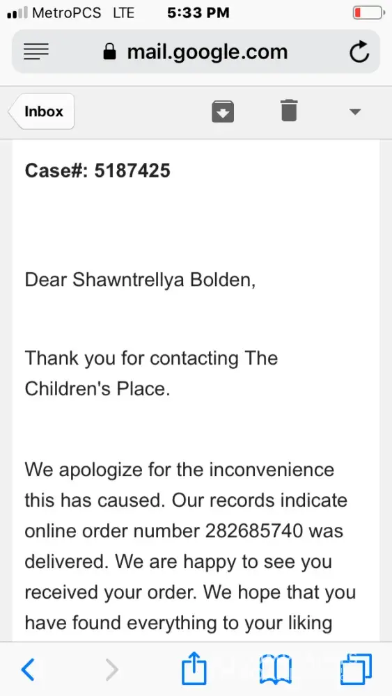 I love the Children's Place and I have never had a problem before but this makes me NEVER want to order online from them again. Customer service is absolutely awful.