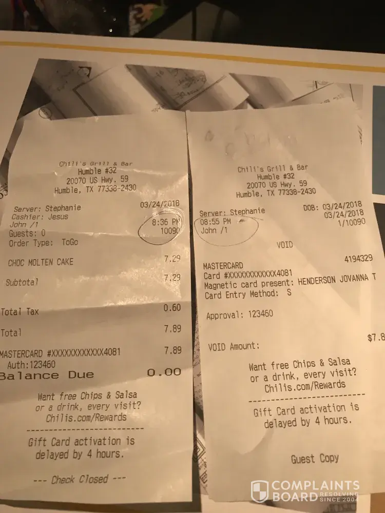 The server brought out the cake on an actual plate a little over 15 mins later, and i said I can Take this plate? He said no, i thought You were going to eat it here, i said Oh no sorry for the confusion, i wanted To eat it on my way home. As i thought To myself, why would i order At the to go if i was Going to be eating it here! He told me ok, he came out almost 10 minutes later with the same cake in a to go box. When i touched the cake, it was so soaked from the ice cream sitting on top of it for a long period of time. I told Him that that was unacceptable and can i just Have a refund. He told me to hold on he needed to get his manager. I thought Maybe she was going to come to see how can she fix the problem. She came to the to go counter and went straight to the register, she didn't say not ONE WORD to me. She did the transaction and the her words to me was "this is the voided amount, and this receipt is your proof" she didn't say sorry about that or anything, so i thought That was extremely rude of her to say she is management! My refund transaction was complete at 8:55pm. I was In chili's almost 40 mins waiting on a cake! And i really Wish i would have took a picture of the presentation of the cake when the guy brought it out in the to go plate, but i was not expecting the manager to respond in such inappropriate manner!